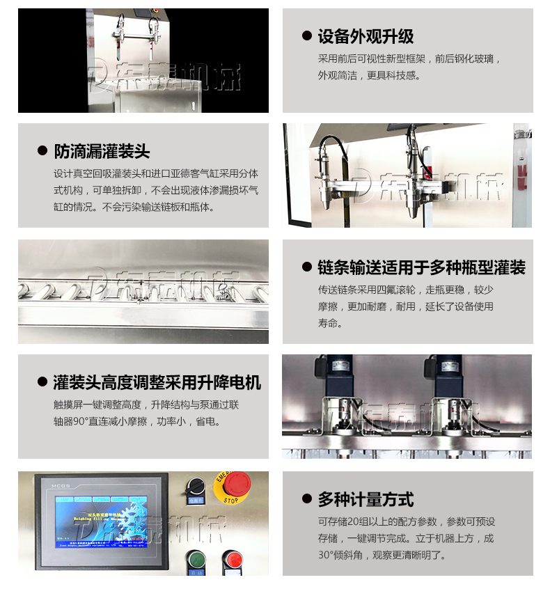 2:半自動油脂灌裝機(jī)采用手動上瓶單速控制灌裝流速,勻速灌裝,使用氣動內(nèi)封閉式灌裝閥嘴可有效防止灌裝過程的滴漏;