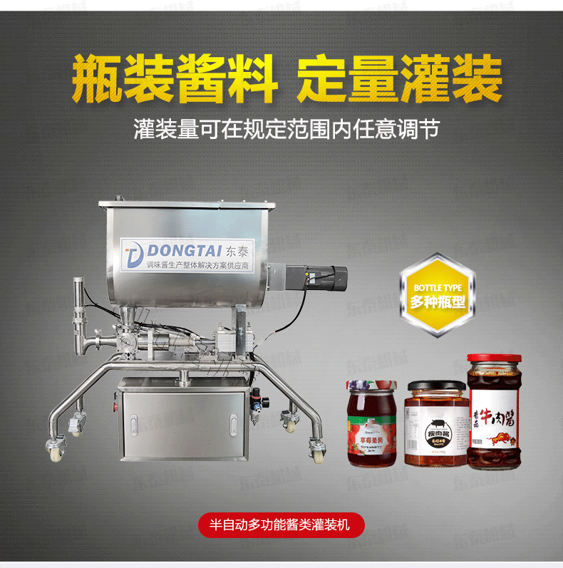 辣椒醬灌裝機(jī) 適合于將各類粘稠體及含有各種固體物質(zhì)如辣椒、花生、肉塊、佐料等物體的醬類和油、料分離的火鍋底料等灌裝于各種容器中,辣椒醬灌裝機(jī) 適用于辣椒醬、顆粒醬料、大塊肉醬、火鍋底料等的灌裝。辣椒醬灌裝機(jī) /半自動(dòng)辣椒醬灌裝機(jī)可灌裝顆粒漿狀流體物料,特別適用于調(diào)味品中帶顆粒并且濃度較大的辣椒醬、火鍋底料等粘稠醬類的灌裝,配置的自動(dòng)攪拌器,辣椒醬灌裝機(jī) 保證了醬和油的充分混合,又稱為辣椒醬灌裝機(jī)、花生醬灌裝機(jī)、豆瓣醬灌裝機(jī)、果醬灌裝機(jī),芝麻醬灌裝機(jī)、粘稠醬類灌裝機(jī)、牛肉醬灌裝機(jī)。