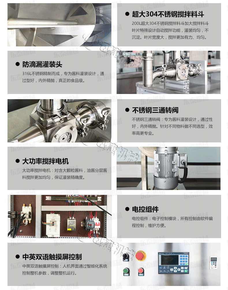 3、醬料灌裝機(jī)采用的臥式攪拌結(jié)構(gòu),醬和油可以得到充分混合,極大的提高計(jì)量的精度和灌裝性能;