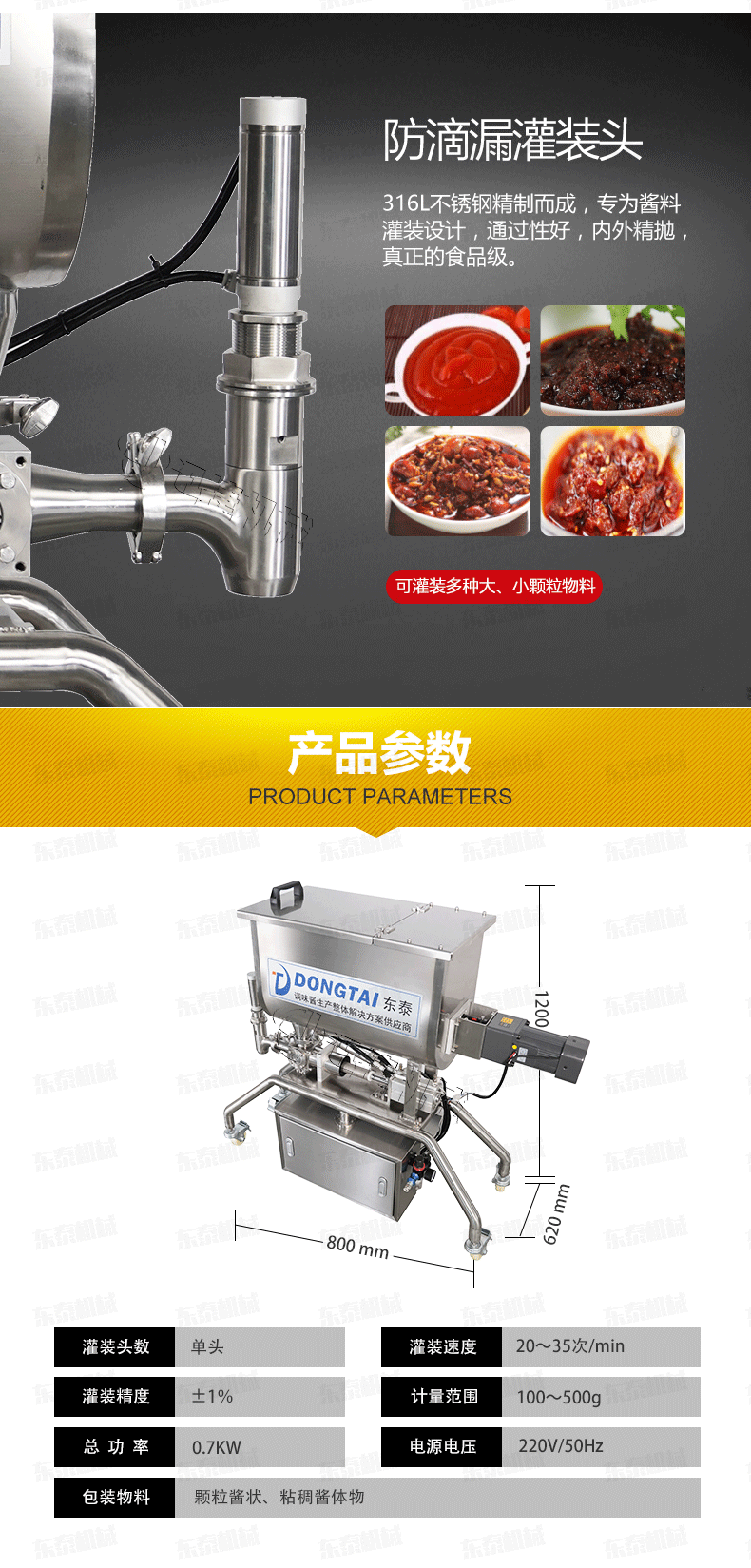 4、顆粒醬定量灌裝機(jī)主要針對食品行業(yè)的醬類分裝設(shè)計(jì)生產(chǎn),香菇醬灌裝機(jī)特別適用于調(diào)味品中帶顆粒并且濃度較大的辣椒醬、豆瓣醬、花生醬、芝麻醬、果醬、牛油火鍋底料、紅油火鍋底料等物質(zhì)的粘稠醬類的灌裝;