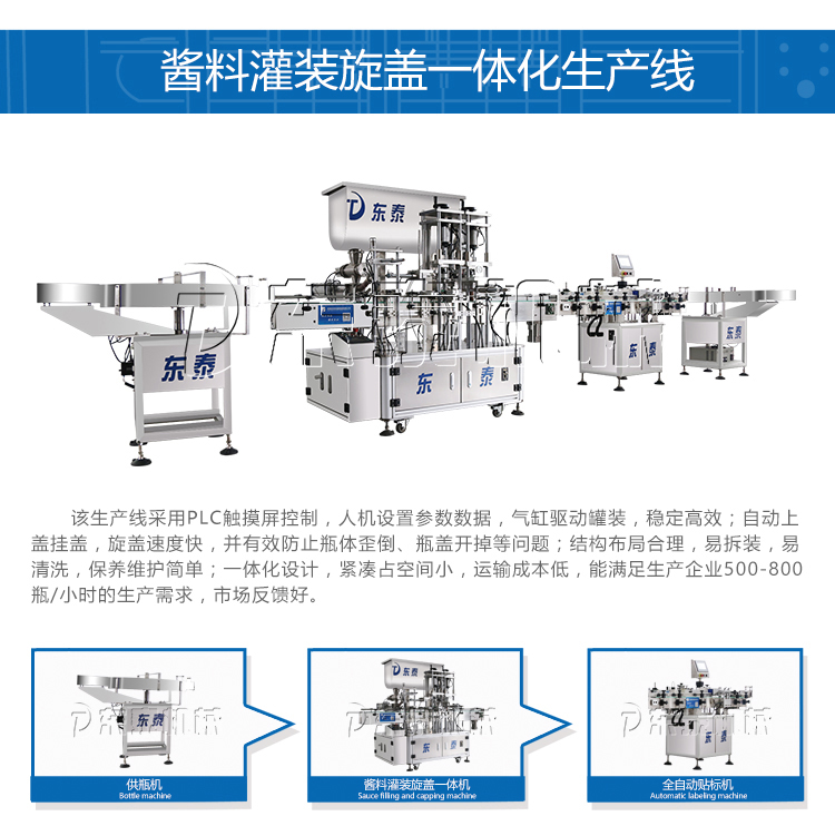 醬類灌裝旋蓋一體機(jī)采用活塞式伺服驅(qū)動(dòng)原理,適用于調(diào)味品中的醬料,濃湯或者帶顆粒并且濃度較大的辣椒醬、豆瓣醬、花生醬、芝麻醬、果醬、濃醬、蜂蜜等較為粘稠醬類的灌裝,自動(dòng)化程度高,機(jī)器能完成自動(dòng)灌裝、自動(dòng)取蓋上蓋,自動(dòng)真空封蓋封口。