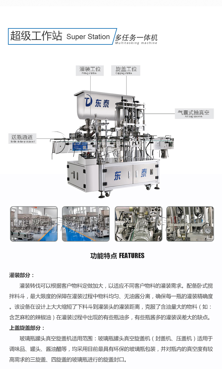 如果是瓶裝的話,可以建議使用我們的辣椒醬灌裝旋蓋一體機(jī)。在一臺(tái)機(jī)械上實(shí)現(xiàn)上蓋灌裝抽真空旋蓋等動(dòng)作。該設(shè)備可以通過大顆粒醬料,攪拌均勻,具有灌裝精密,運(yùn)行穩(wěn)定可靠、工作效率高、壽命長、維護(hù)間單等特點(diǎn)。廣泛適用于各種含顆粒的半流體、膏體、醬料的灌裝,也可灌裝各種粘稠體等,價(jià)格方面也非常合適。