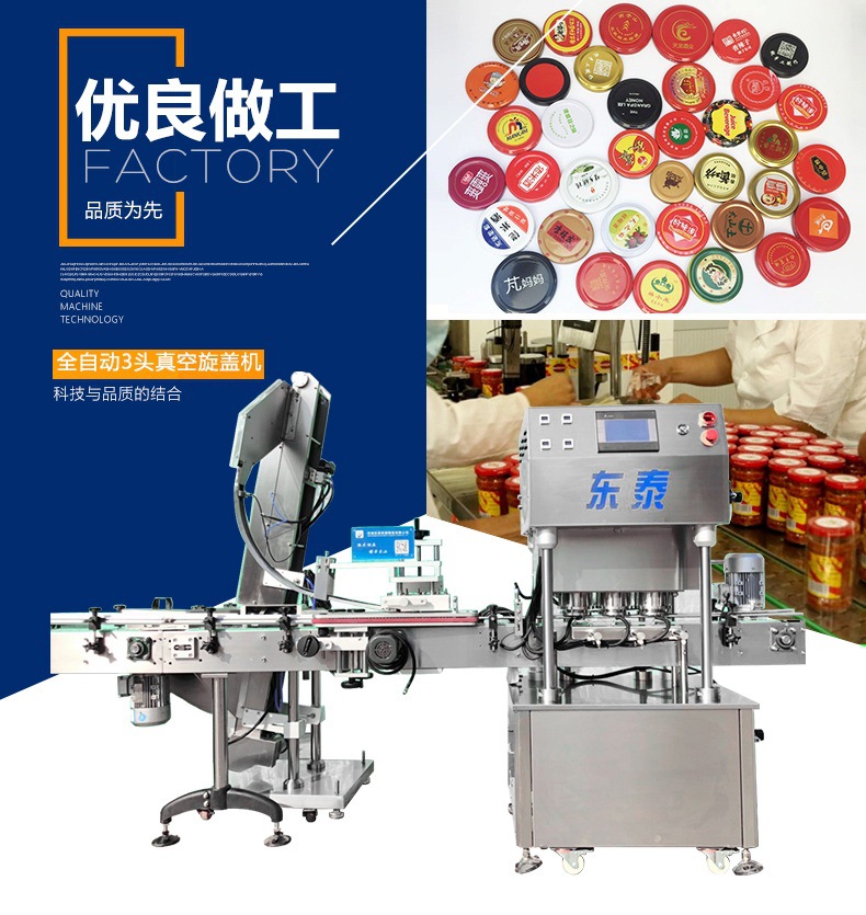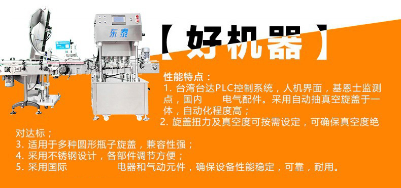 該直線式真空旋蓋機(jī)是東泰機(jī)械結(jié)合用戶使用情況,摒棄了傳統(tǒng)轉(zhuǎn)盤式真空旋蓋機(jī)的弊端,研制開發(fā)的新型高效設(shè)備,設(shè)備自動檢測到兩個瓶子蓋子進(jìn)入到雙頭真空旋蓋機(jī)內(nèi),旋蓋機(jī)彩色顯示屏?xí)?shí)時顯示旋蓋狀況,整機(jī)多點(diǎn)檢測,當(dāng)進(jìn)口無瓶無蓋、出口堵塞、定位不準(zhǔn)、瓶身傾倒均自動停機(jī)。單個旋蓋頭達(dá)到的真空度都可以單獨(dú)顯示,單獨(dú)調(diào)整。合格