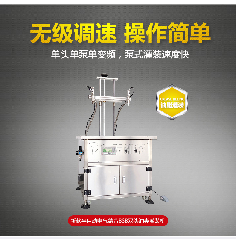 半自動雙頭食用油灌裝機主要是應用于各種食用油、潤滑油等粘稠液體的定量灌裝,如花生油,大豆油,菜籽油、香油,潤滑油等油類的灌裝。還擁有這先進的定量灌裝技術,結合了微電子智能控制技術有著單頭單變頻控制系統(tǒng),實現(xiàn)高精度、無級調(diào)速,操作方便。兩個灌裝頭能夠在一定的范圍內(nèi)隨意調(diào)節(jié)間距和灌裝量,能夠使用多種大小形狀的容器的灌裝。自動化程度高。另外,半自動雙頭食用油灌裝機的機身零件選用的事優(yōu)質(zhì)不銹鋼,耐用又衛(wèi)生,長時間工作性能可靠穩(wěn)定。本公司產(chǎn)品通過了IS9000質(zhì)量體系認證。設備經(jīng)久耐用,性能穩(wěn)定,是食用油、潤滑油等行業(yè)理想的灌裝設備。